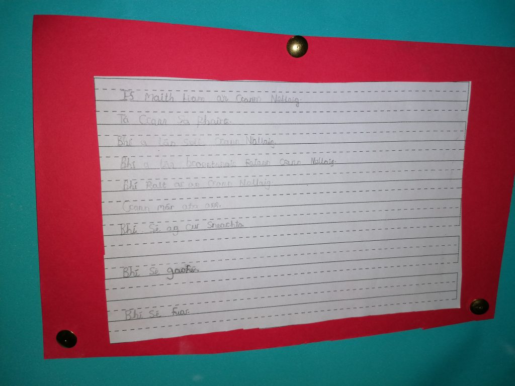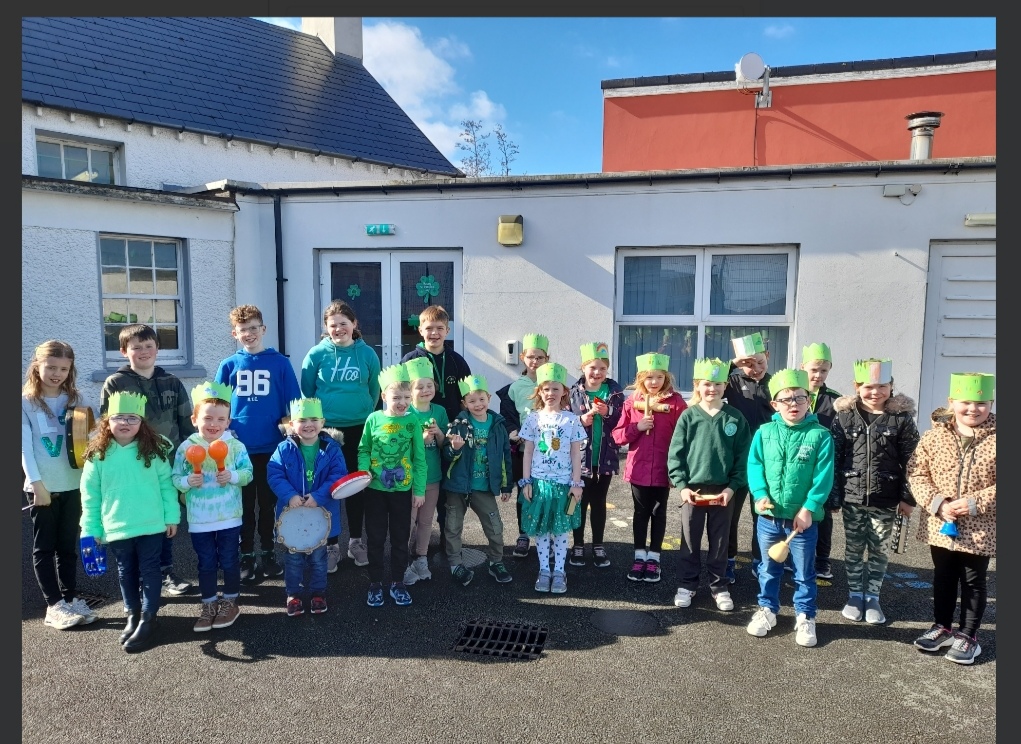 Rinne na pĂĄistĂ cĂ©iliuradh mĂłr fĂĄ choinne lĂĄ le PĂĄdraig i mbliana. Rinne na pĂĄistĂ ealaĂn galĂĄnta- hĂĄtaĂ agus seamrĂłga don ĂłcĂĄid speisialta. D’fhoghlaim na pĂĄistĂ na h-amhrĂĄin nua ‘Teir Abhaile ‘RiĂș’ agus ‘Beidh Aonach AmĂĄrach’ le MĂșinteoir GrĂĄinne. Sheinn na pĂĄistĂ san Ard-Rang an bodhrĂĄn leis an ceol. BhĂ sĂ© thar barr! GhlĂ©as na pĂĄistĂ suas in Ă©adaĂ glasa ar an 16Ăș de MhĂ MĂĄrta agus ghlac achan duine pĂĄirt i mĂłr shiĂșil timpeall na scoile leis na h-uirlĂ©isĂ ar fad âïž