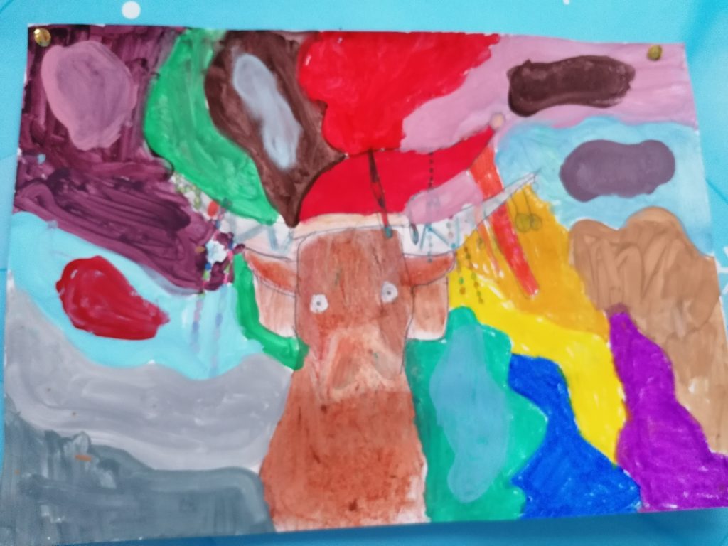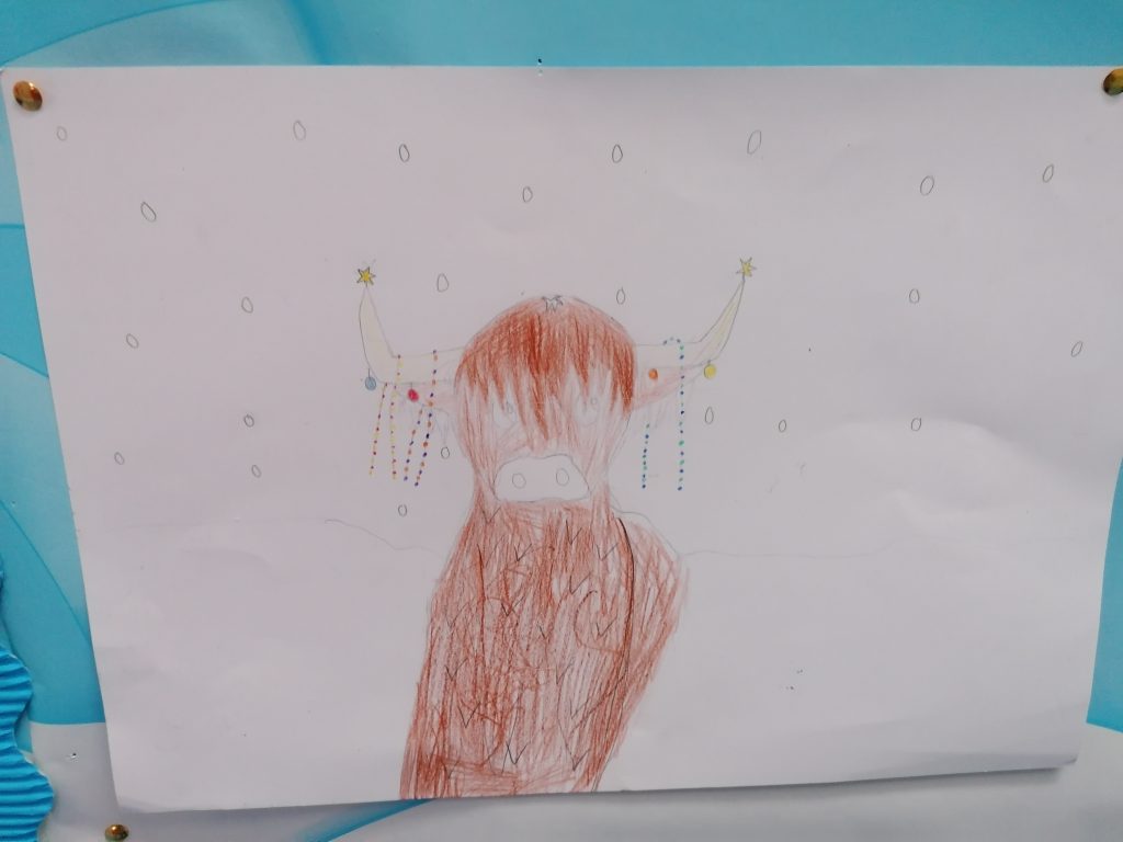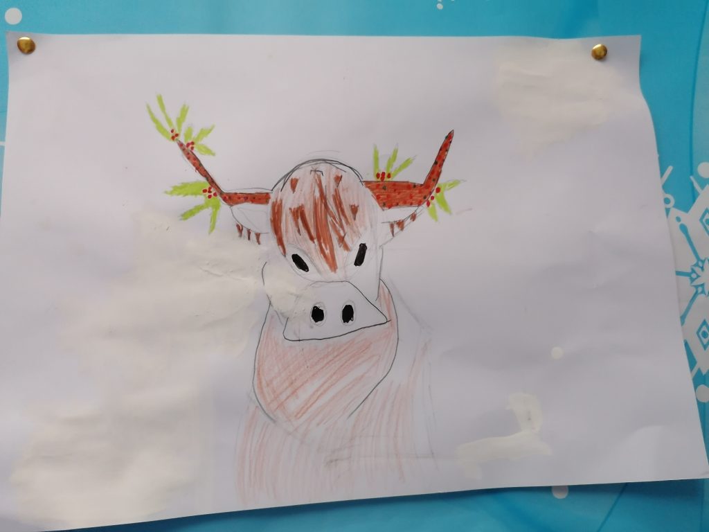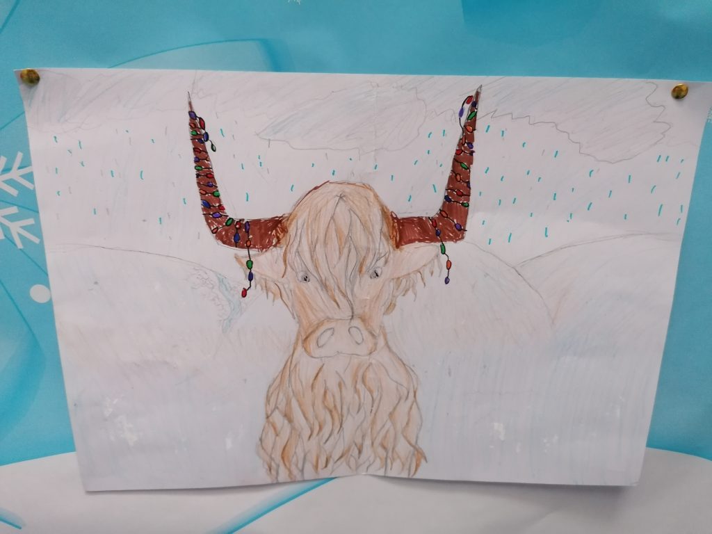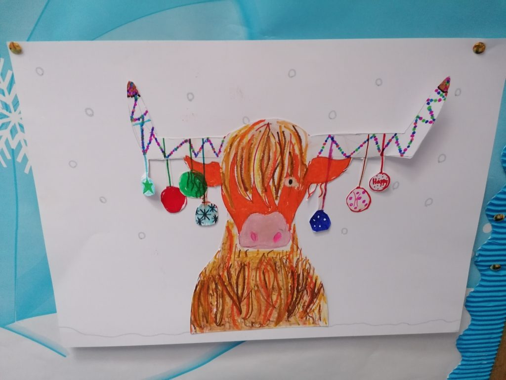 The highland cow really captured the attention of the whole class. ‘Imagine decorating their horns for Christmas’ was a throw away comment from one child which turned into a beautiful, creative art lesson. Check out the children’s festive looks for their highland cows!