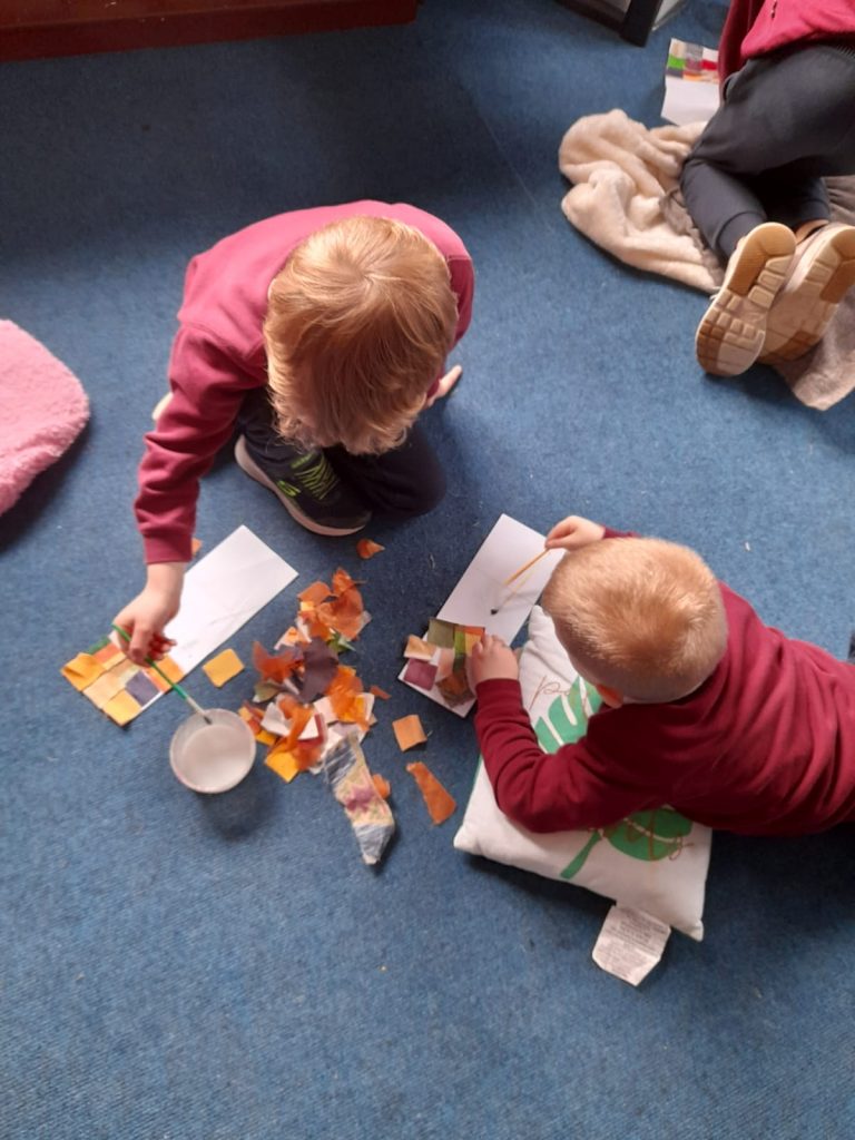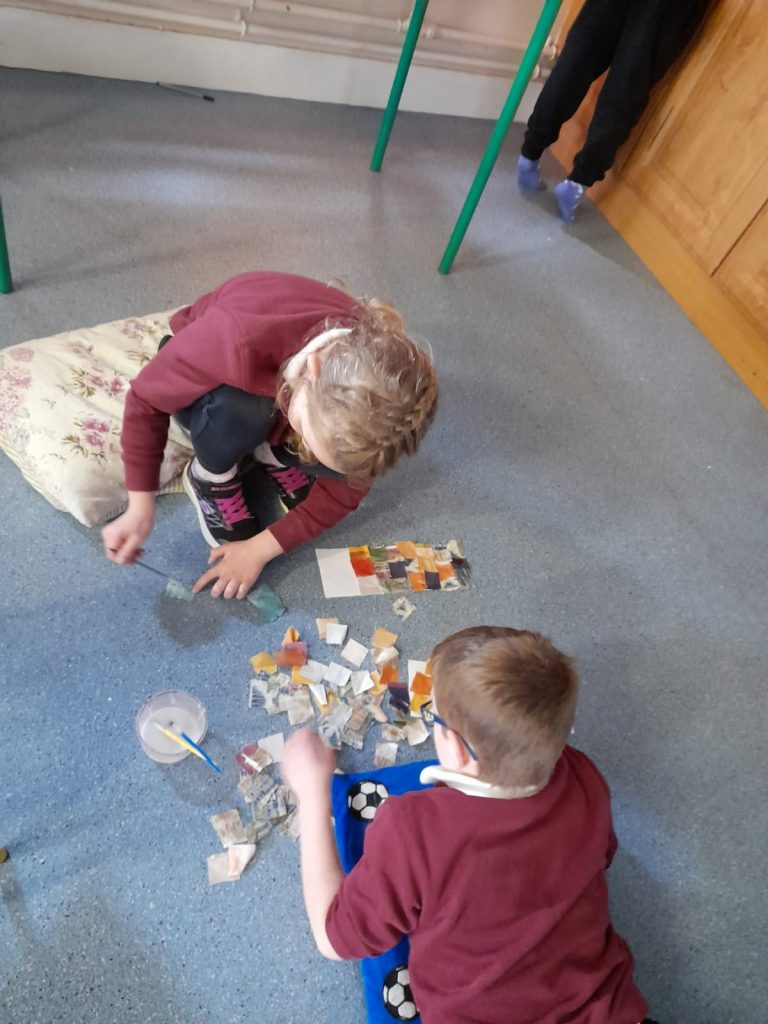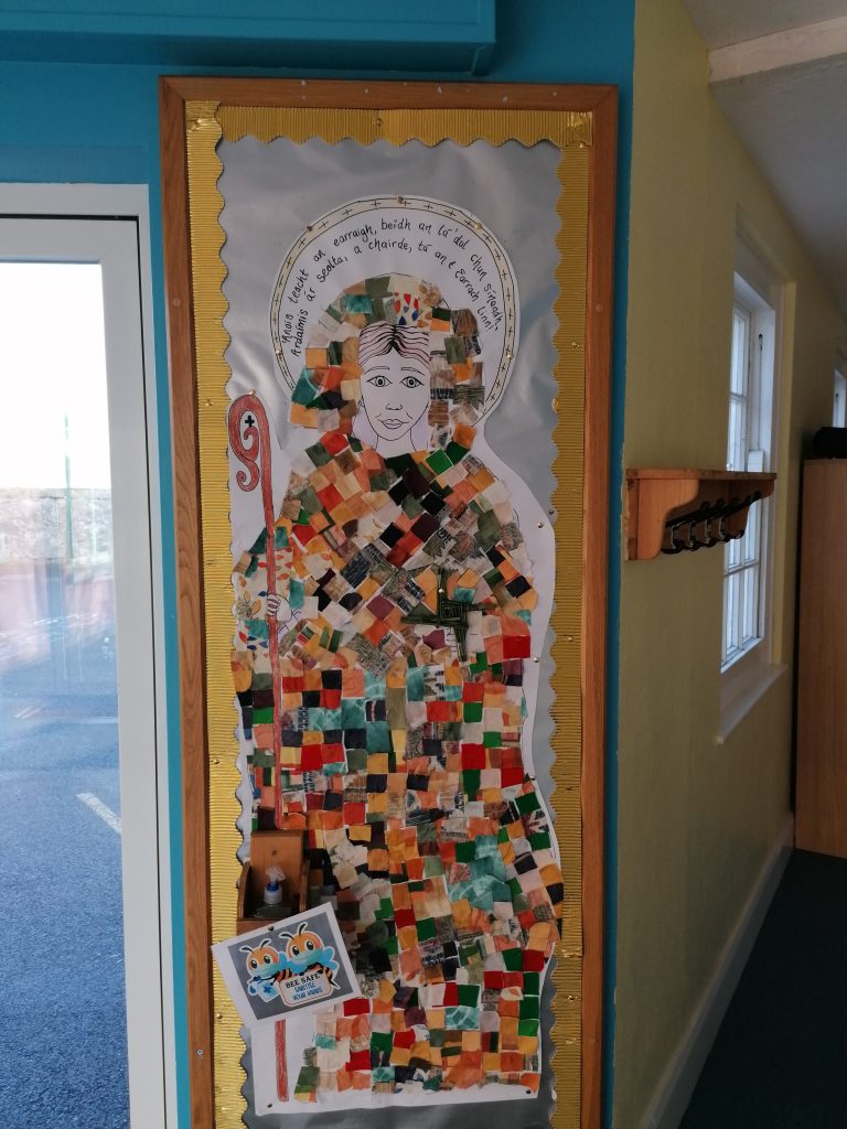 The senior class have explored the art of collage making for the past few weeks. The senior class skillfully worked with the junior class to re-create St. Brigid’s famous cloak. Every child made a cross (or a few) and made a few patches of the cloak!