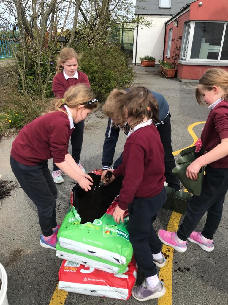 The children set potatoes with MĂșinteoir RĂłisĂn which have grown so much already.