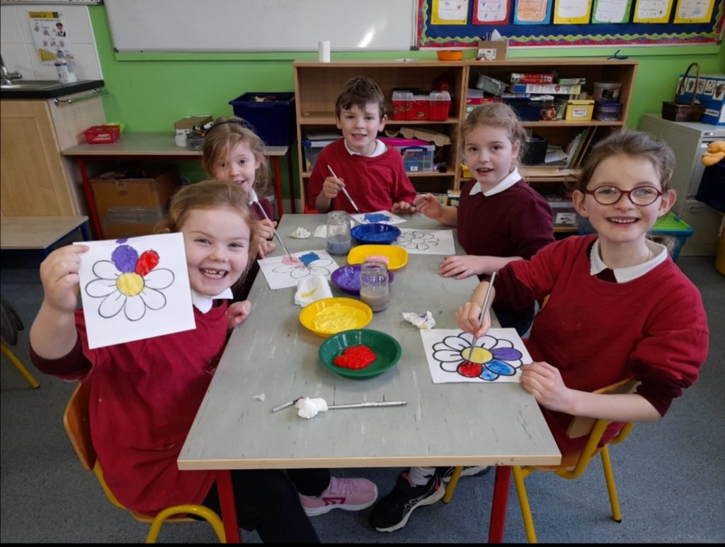 The children also helped MĂșinteoir GrĂĄinne and CĂșntĂłir Madeline on another lovely back-drop which really complemented our lovely drama.