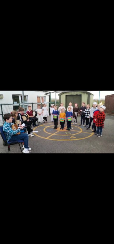 The children of Ballyheerin NS have astounded us with a dramatic take on the classic Christmas tale ‘The Little Drummer Boy’. Not only did we have one little drummer boy, we had four ( John, Adam, Ryan and Kyle)! We also had a family (Aaron, Jack, Kaitlyn, Chloe and Ceala), 3 shepherds ( Kelsey, Sarah and Marah), 4 angels ( Sophie, Maggie, Natasha and Abbie), 3 wise men (Daryl, Gareth and Callum) and of course Mary and Joseph (Abby and Charlie). Every child from junior infants to sixth class had a part in our play and they all gave a fantastic performance.